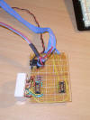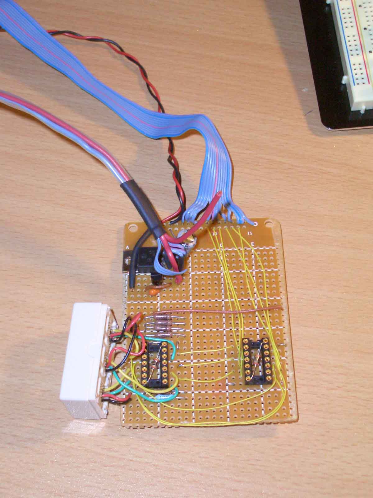To power some super-bright LEDs (and to make a brightness controller for night use) I used 7407 chip from TI, and a voltage converter chip on another card. The LEDs connect via phone RJ8 plugs and sockets. The variable voltage regulator controls brightness. (Connected to a switch+potentiometer from Radio Shack.)