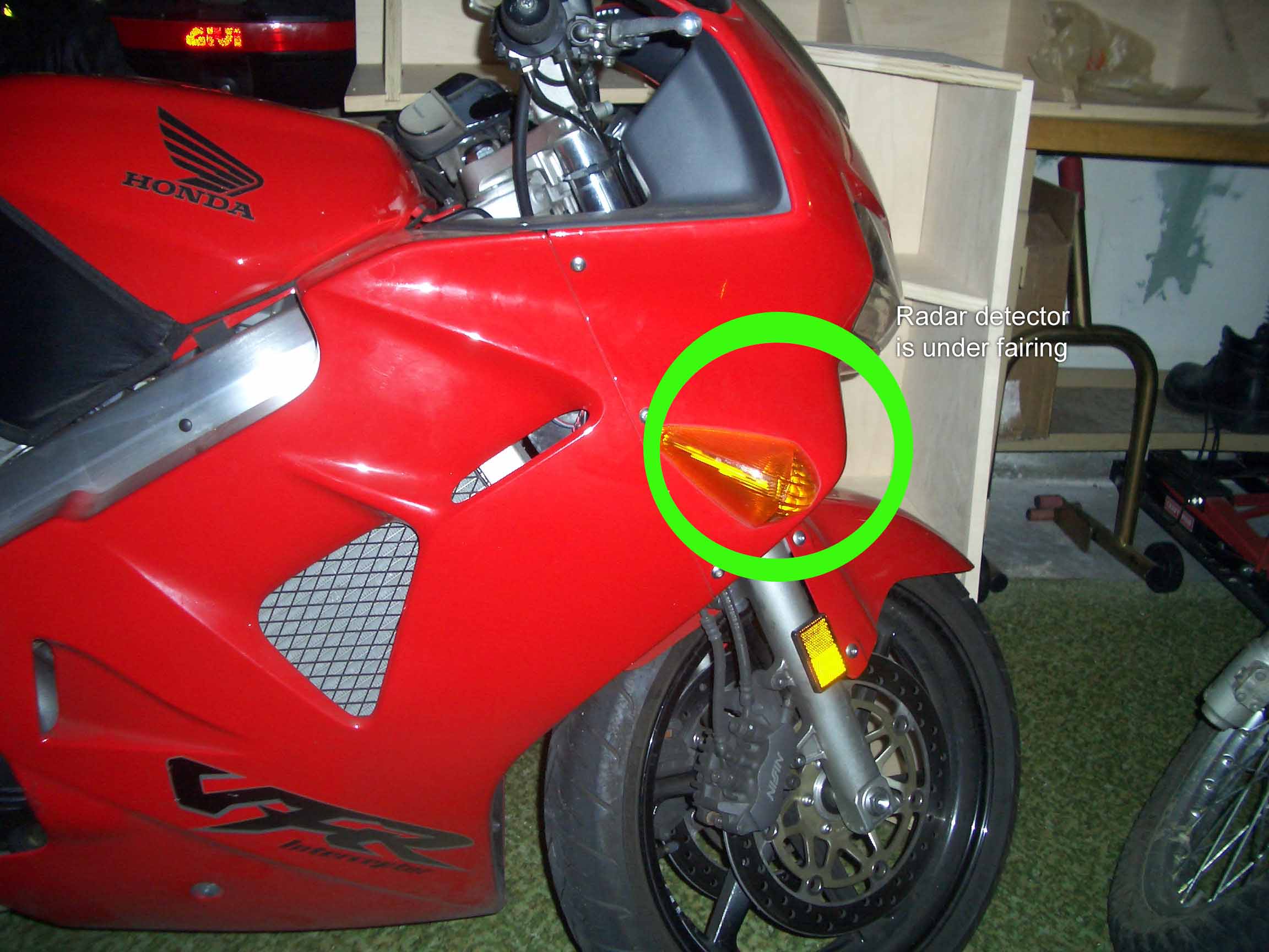 And here are some bad pictures of the radar detector mounted inside the front right fairing. It's secured with epoxy (to the metal mount) and industrial (T-hook) Velcro. Fairly secure.