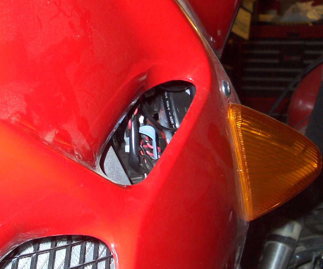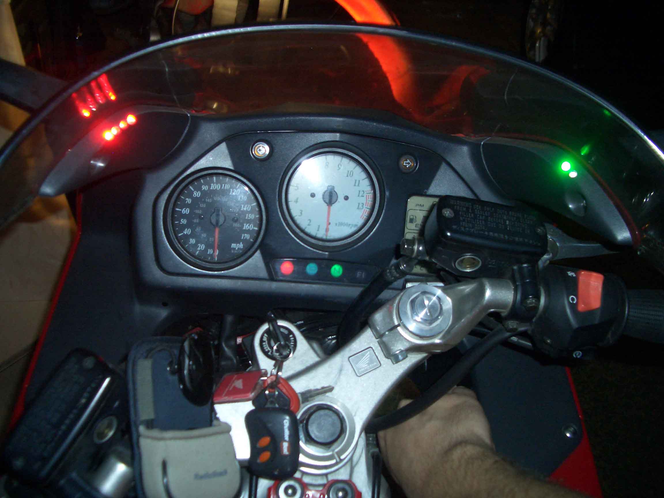 I mounted 6 super-LEDs in the VFR's ears: 4 red ones for signal strength (left) and a green and blue on the right for signal type.